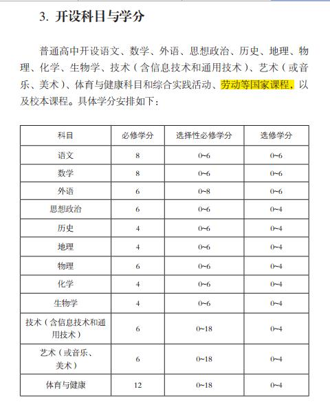 最新方案中,后面的科目设置与学分也有变化,方案要求,普通高中开设语文、数学、外语、思想政治、历史、地理、物理、化学、生物学、技术(含信息技术和通用技术)、艺术(或音乐、美术)、体育与健康科目和综合实践活动等国家课程以及校本课程之外,还应开设劳动课程,劳动共6学分,其中志愿服务2学分,在课外时间进行,三年不少于40小时;其余4学分内容与通用技术的选择性必修内容以及校本课程内容统筹。